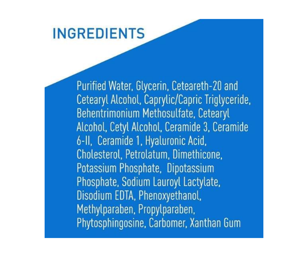 يتميز المرطب بتقنية MVE الحاصلة على براءة اختراع لإطلاق موجات مستمرة من مكونات الترطيب لدعم الجلد ويحسن من مظهر الخطوط والتجاعيد ويعطي اشراقة للبشرة ، يحتوي على مكونات داعمة لدرع الجلد مثل السيراميد الذي يوجد بثلاث انواع لدعم طبقات متعددة من الجلد و الهيالورونيك اسد الذي يرطب الجلد ويحميه من الجفاف وعلامات التهيج . مناسب لكل انواع البشرة ، يجعل الجلد بملمس مخملي ناعم غير لزج وغير دهني . آمن للبشرة الحساسة وتلك التي تحتوي على الاگزمة او الصدفية او مشاكل جلدية اخرى . حاصل على ختم القبول من الجمعية الوطنية للأكزيما (NEA). خالي من العطور ، خالي من البارابين ، تم اختباره للحساسية ، وغير كوميدوغينيك.